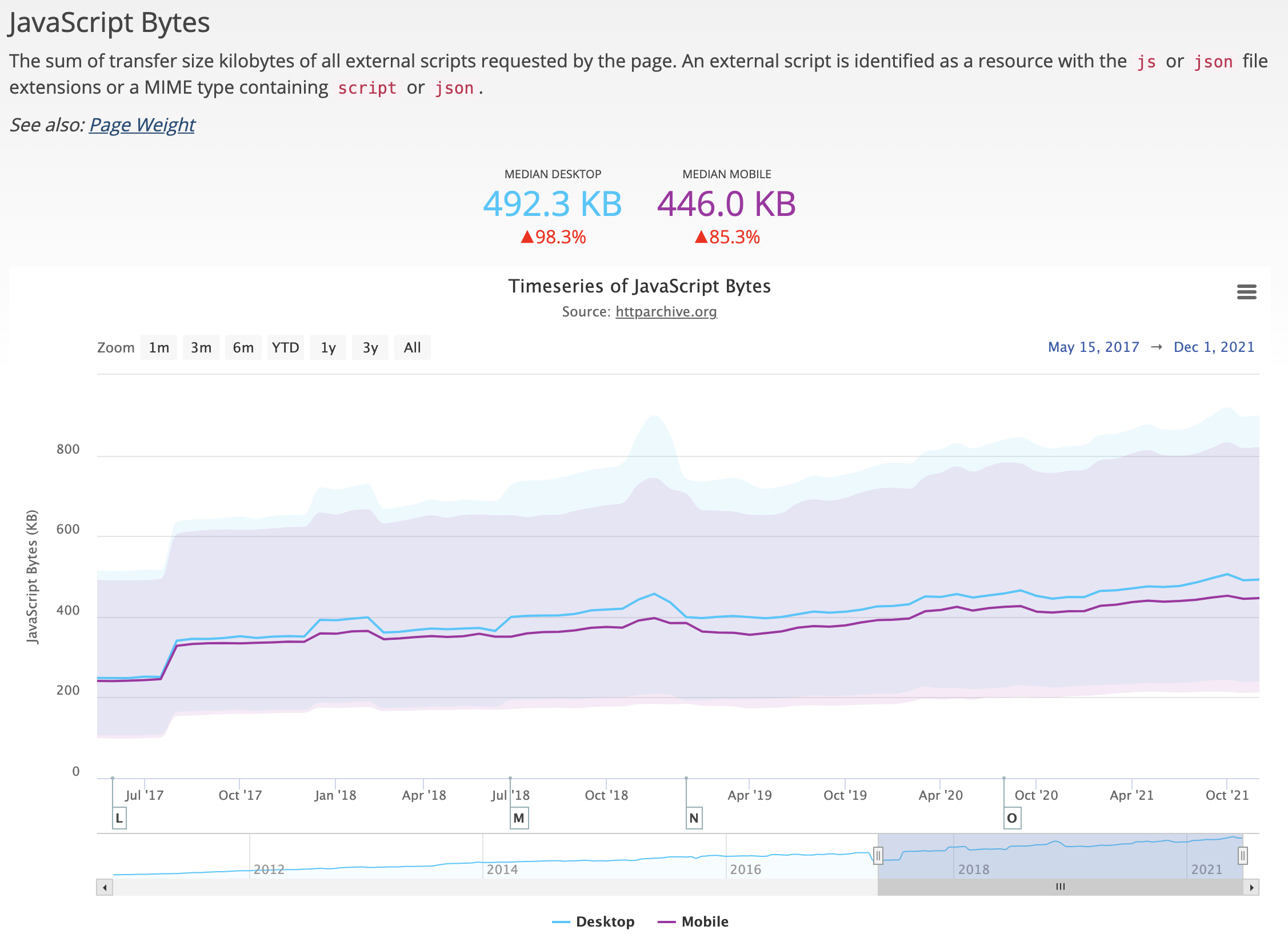 HTTP Archive가 보여준 2022년 1월 기준 자바스크립트의 평균 전송 크기는 데스크톱 약 492KB, 모바일 약446KB 정도 입니다.