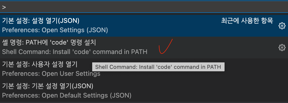 command + shift + p를 누르면 code 명령 설치를 눌러준다.