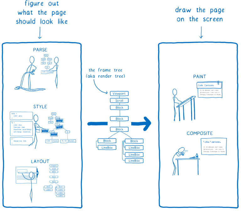 다운로드, 파싱, 스타일, 레이아웃, 페인트, 합성으로 나뉘는데 단계마다 어떤 일이 발생하는지 알아보겠다.