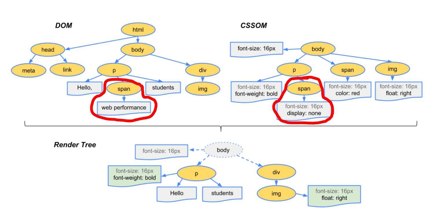 위에서 Dom Tree에 있는 web performance가 Render Tree에 없는 이유는 CSSOM에서 display: none을 적용했는데 화면에 보일 필요가 없는 것들을 Render Tree에는 반영이 되지 않는 것을 볼 수 있다.
