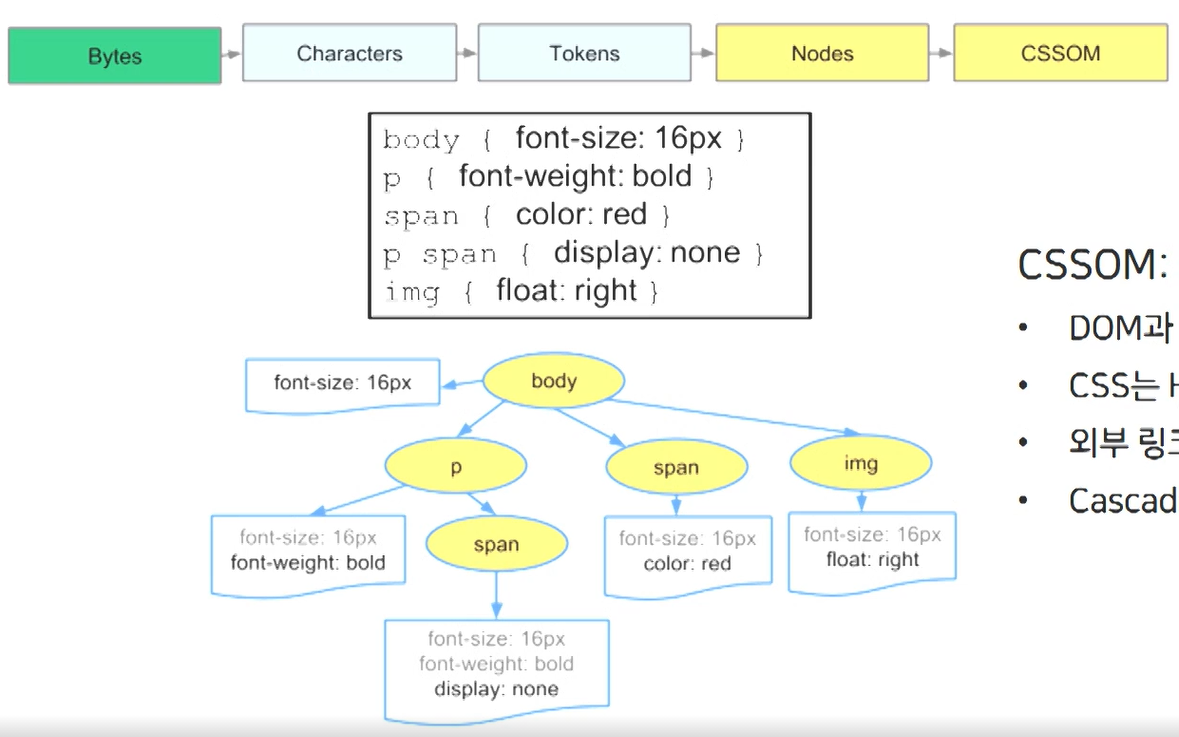 HTML 또는 리소스에 CSS가 포함된 경우에는 CSSOM 트리 구성 작업도 함께 진행한다.