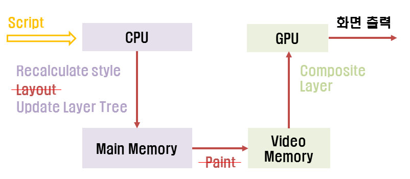 - 필연적으로 Recalculate Style, Update Layer Tree, Composite Layer는 꼭! 발생